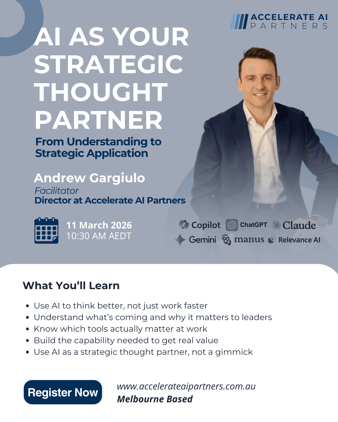 The real opportunity is bigger. It's understanding where AI is actually headed, what it means for your business and workforce, and learning to use AI as a genuine strategic collaborator, not just a productivity tool. This session takes you from surface-level usage to strategic application.